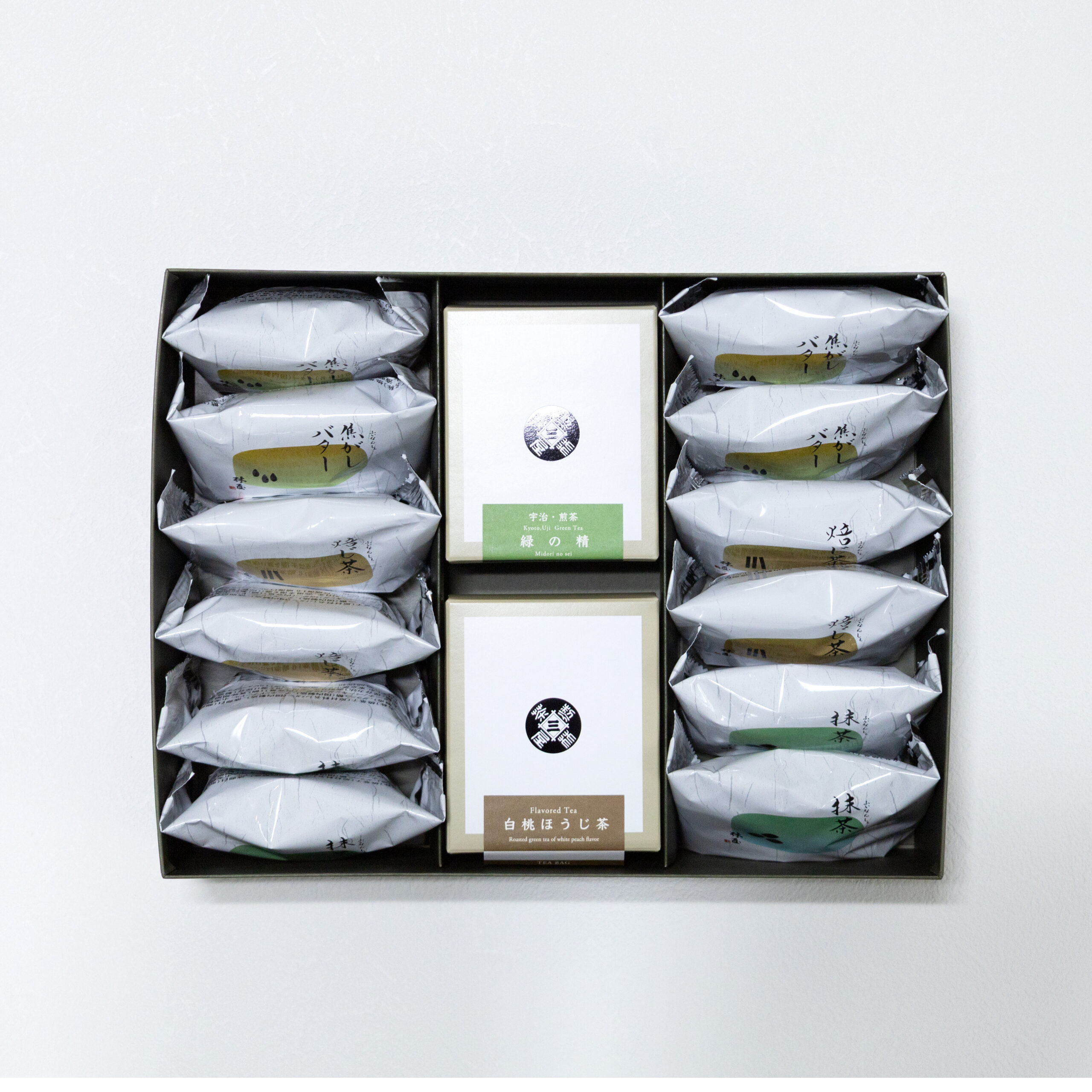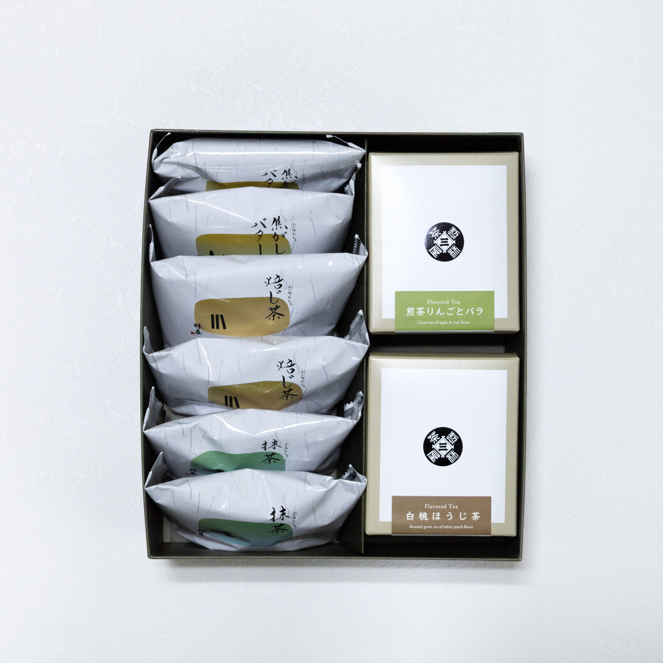 宇治の厳選されたお茶の香りを楽しめるティーバッグと、3種類の味を楽しめる「ふぃなんしぇ」をセットにしました。